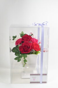 プリザーブドフラワーの商品は、全てクリアケースにお入れしリボンを掛けてお届けしております。