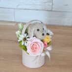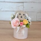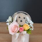 可愛い犬とプリザーブドフラワーのアレンジメント。